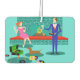This Retro Couple with Dog Air Freshener looks like a scene out of a romantic comedy. The 1960s's style, minimalist art design features an attractive couple enjoying a romantic evening at home. The sophisticated room prominently features an aqua and teal brick fireplace with a bright red ledge. A beautiful, redhead woman wearing a bright, pink dress is perched on the ledge. She is enjoying a martini with a floating olive, a roaring fire, good music, and the company a tall, dark and handsome man. The man is wearing a blue suit and red tie. His martini glass is raised to toast his charming companion. In his other hand, he is holding a vinyl record album. At his feet, we see a most adorable dachshund wearing a red collar. The playful wiener dog is walking in the direction of a green record player with orange, spindle legs. On the floor, there is a colourful group of fun, eclectic, vinyl records. Cheers! Here's to the perfect evening at home.