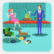 These Retro Couple with Dog Stickers look like a scene out of a romantic comedy. The 1960s's style, minimalist art design features an attractive couple enjoying a romantic evening at home. The sophisticated room prominently features an aqua and teal brick fireplace with a bright red ledge. A beautiful, redhead woman wearing a bright, pink dress is perched on the ledge. She is enjoying a martini with a floating olive, a roaring fire, good music, and the company a tall, dark and handsome man. The man is wearing a blue suit and red tie. His martini glass is raised to toast his charming companion. In his other hand, he is holding a vinyl record album. At his feet, we see a most adorable dachshund wearing a red collar. The playful wiener dog is walking in the direction of a green record player with orange, spindle legs. On the floor, there is a colourful group of fun, eclectic, vinyl records. Cheers! Here's to the perfect evening at home.