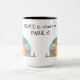 Here's a cute mug, especially for someone who loves their camper! A funny blue camper is decorated with a string banner and bright gold and pink. The image is printed on two sides of the mug, with the text "HOME is where we PARK it" at the middle, but you may easily remove it or change it. Perfect for those who like to "hit the road".