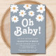 This cute baby shower invitation is decorated with white daisies and stylish retro typography on a blue background.