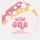 Retro inspired Wild One first birthday invitation sticker with 70's style daisies and boho fonts and colours.