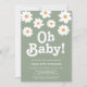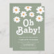This cute baby shower invitation is decorated with white daisies and stylish retro typography on a green background.