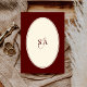 The invitation features a warm ivory background framed by a delicate double-line burgundy border, offering a balanced and tailored look reminiscent of European estate stationery and private club correspondence. At the center, an elegant oval frame highlights your monograms in a romantic script paired with classic serif typography, creating a beautiful contrast that feels formal, intentional, and enduring.