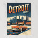 A retro-themed travel poster for Detroit, Michigan, features an orange classic car driving on a road towards a cityscape with industrial buildings and factories under a dark blue sky with an orange gradient. "DETROIT" is prominently displayed at the top.