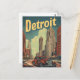 This Detroit postcard features a bold, vintage-inspired illustration that captures the city’s iconic automotive heritage. A classic car takes centre stage in the foreground, its sleek lines and retro styling set against the backdrop of the Detroit skyline, rendered in warm, nostalgic tones. Above the cityscape, the word “Detroit” is displayed in a lively retro font, evoking the spirit of mid-century travel posters.