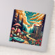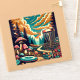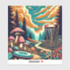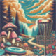 A unique colourful disc golf course in a field of retro mushrooms, pine trees and clouds in vintage colours like orange, blue and red.