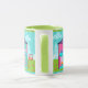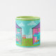 This Retro Dream House Mug will add a touch of whimsy to your day. The design features a cartoon drawing of a classic, child's dollhouse. The two-story dollhouse shows every little girl's idea of glamour. The kitchen features turquoise and pink walls and flooring, a light pink refrigerator, an orange table and chairs, and a blue, starburst clock. The man of the house is sitting at the table enjoying a little down time. His black suit and yellow hair are visible behind the morning newspaper. There is a luscious, three layer cake with pink and chocolate frosting sitting on the table. In the adjacent living room, a stunning, platinum blonde woman is posed on a hot pink couch. She looks like a living doll in her strapless yellow dress that is perfect for enjoying the fire in the pink cone fireplace. On the turquoise floor, there is a zebra print rug. There is also an orange ottoman in the room. The walls are sea foam green and pink brick. A yellow, Sputnik light fixture is dangling from the ceiling. Behind the sofa, there is framed artwork of a pink, stiletto shoe. Upstairs, we can see the master suite. The bedroom carries on the turquoise and pink decor that is so prevalent in the house. There is a sea foam green bed with purple bedding. Beside the bed, a pair of pink, stiletto shoes are visible. On the wall, there are four pop art prints of the lady of the house. In the corner of the bedroom, there is a tall floor lamp with a yellow and blue, mid century modern lampshade. The bathroom has a turquoise and pink tiled floor and a light pink toilet and claw foot bathtub. The sea foam green wall is offset by the turquoise and pink floral wallpaper border. The residents don't need to worry about doing any upgrades and maintenance in this house. The purple shingles on the roof are water tight! The house is sitting on a perfectly manicured green lawn with pink and yellow flowers. There is a white picket fence behind the dream house. An aqua skyline is marked only by the silhouettes of fluffy, light blue clouds and cedar trees. Beside the house, there is a red For Sale sign on a white post. And, of, course, the most noteable feature is the word, "SOLD" on the sign!