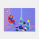 This Retro Evening at Home Door Mat looks like a scene out of a 1960's romantic comedy. The minimalist design features an attractive cartoon couple in the living room of a mid century modern house. The room prominently features a purple and blue stone wall and a matching purple and blue striped rug. Against the wall, there is a turquoise, cone shaped fireplace with a roaring fire. In the corner, the suave man of the house is lounging in a red egg chair. He is wearing a blue suit with a blue tie. In one hand, he is holding a martini glass. No wonder he's so relaxed! Hanging from the ceiling, there is a yellow, Sputnik light fixture. A woman with an hourglass figure is sitting on the rug. She is wearing a vibrant, blue dress and not a hair is out of place in her flippy blonde "do". Beside her, on the floor, there is a blue and black portable record player. Several vinyl record albums are scattered near the beautiful deejay. Go ahead and sing along. You know you want to!