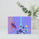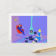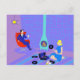 This Retro Evening at Home Postcard looks like a scene out of a 1960's romantic comedy. The minimalist design features an attractive cartoon couple in the living room of a mid century modern house. The room prominently features a purple and blue stone wall and a matching purple and blue striped rug. Against the wall, there is a turquoise, cone shaped fireplace with a roaring fire. In the corner, the suave man of the house is lounging in a red egg chair. He is wearing a blue suit with a blue tie. In one hand, he is holding a martini glass. No wonder he's so relaxed! Hanging from the ceiling, there is a yellow, Sputnik light fixture. A woman with an hourglass figure is sitting on the rug. She is wearing a vibrant, blue dress and not a hair is out of place in her flippy blonde "do". Beside her, on the floor, there is a blue and black portable record player. Several vinyl record albums are scattered near the beautiful deejay. Go ahead and sing along. You know you want to!