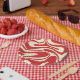 Retro Fantasy Swirl Abstract in Christmas Red and Cream. Trippy boho 60s 70s 80s 90s contemporary modern aesthetic; a bit psychedelic; very cool. Swirling waves of colour. By Kierkegaard Design Studio.