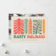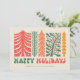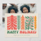 This vibrant holiday card embraces a retro design featuring a series of stylised trees in shades of red, orange, and green, each with its own unique, decorative pattern. The trees are adorned with stars, berries, and festive branches, evoking a sense of holiday cheer and whimsy. The words "Happy Holidays" are displayed in bold, playful font at the bottom, adding a nostalgic touch to this delightful design. Perfect for sending joyful greetings during the festive season with a vintage flair.