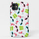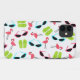 An iPhone 5 case featuring a pattern consisting of pink flamingos, green flip flops, and retro blue cat eye sunglasses.