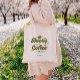 An elegant green and gold "books + coffee" tote bag, designed with retro lettering and florals, perfect for book lovers and coffee lovers. Features a customisation section for you to add your name, initials, or custom text.