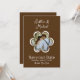 This custom Save the Date for the wedding announcement features a retro, 1970s inspired theme. The background is a chocolate brown colour, with brown text and the names of the couple printed in an elegant script font. A white and brown 70s style flower is printed in the centre. A sample photo is placed inside the flower frame which can be personalised to include your own custom photo or other image.
