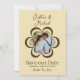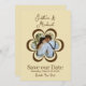 This custom Save the Date for the wedding announcement features a retro, 1970s inspired theme. The background is a soft yellow colour, with brown text and the names of the couple printed in an elegant script font. A matching brown, 70s style flower is printed in the centre. A sample photo is placed inside the flower frame which can be personalised to include your own custom photo or other image.