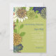 A floral retro design graces two sides of this invitation. The olive green background has white, blue, red, gold and green flowers. Well-suited for any feminine celebration.