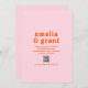 Modern style wedding invitations featuring a simple and minimal layout with your names in a groovy retro font. Below are your event details in a sans serif font along with your QR code (optional) for guests to scan and easily RSVP online. The bright colour scheme is vibrant orange and pink. The QR code may be removed and the fonts / colours may be changed in the design editing tool.
