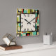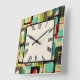 10.75” x 10.75” square acrylic wall clock with a fun retro image of black, brown, red and mustard frames, black and yellow patterned rectangles, and turquoise and white squares on tan. The cream square has a black border and Roman numeral clock face. See the entire Nifty 50s Clock collection in the DECOR | Clocks section.