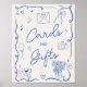 Announce the designated area for cards and gifts with our charming french blue retro Cards and Gifts Poster Sign! This delightful sign features a retro-inspired design, adorned with whimsical elements such as balloons, cameras, hearts, and a lovely bouquet of flowers in a vase. Framed by a playful squiggly wavy ribbon, this sign adds a touch of vintage elegance to your bridal shower decor. With customisable colours and a hand-written font, it effortlessly guides guests to the perfect spot to leave their well wishes and presents. Let this sign be a charming addition to your celebration, ensuring all gifts are received with love and gratitude!