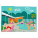 This Retro Gay Pool Party Gift Bag features four hunky beefcakes having a gay old time as they beat the Palm Springs heat by lounging around the turquoise blue water of their atomic boomerang shaped swimming pool. The mid century modern architecture on the fabulous, orange stone house is clearly prime real estate, given the view of the mountains in the background. A yellow starburst sun shines brightly in the turquoise sky so you are able to see every charming detail--from the kitschy, pink flamingos to the 1950’s striped, breezy blocks fence. And of course what Palm Springs House would be complete without a palm tree?