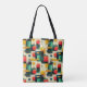 This tote features a vibrant retro geometric pattern, showcasing a mix of rectangles, circles, and lines in red, yellow, green, and blue tones against a neutral background. Perfect for those who love abstract designs and vintage-inspired styles, this bag adds a pop of colour and artistic flair to any outfit.