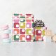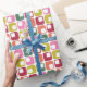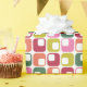 A sleek modern geometric print in retro 1970s colours of red, green, orange, pink and lime green on white is the perfect way of adding some vintage style to your holiday gifts this year.
