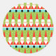 Any way you look at it these Retro Geometric Santa Round Stickers are pure holiday whimsy! It’s rows of Santas. No, it’s rows of Christmas trees. No, it’s rows of Santas shaped like Christmas trees and rows of cheery green Christmas trees with white polka dots. It’s kitschy. It’s colourful. And it if doesn’t put you in the holiday spirit, something is definitely wrong with you! Each identical triangular Santa Claus is wearing his trademark red and white suit and hat. Each hat has a yellow starburst on top, which serves as a tassel for Santa’s headwear and a vintage star for a Christmas tree. Old Saint Nick has a well-groomed white beard, jolly red nose and cheerful curved eyes. Each Santa’s black boots also serve as a trunk to a Christmas tree. Where Santa’s feet and tree trunks meet, there is a stripe of mid century inspired aqua. A purchase of this product is guaranteed to keep you off the naughty list no matter what you’ve done!