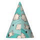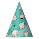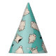 Cute halloween party hats featuring a groovy blue background, a group of retro ghosts, and creepy spiders.