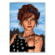3D digital render of a beautiful retro girl on a cityscape and a blue sky background, painting effect
