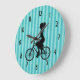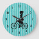 A cute retro graphic illustration. A silhouette of a woman in a ponytail, wearing a dress and riding a bicycle. The background is a turquoise blue striped pattern with alternating light and dark tones.