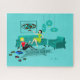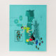 It looks like it’s going to be a fun time with this kitschy Retro Girls’ Night In Puzzle. The 1960’s style, minimalist art design features two women with pink cocktails in a thoroughly mid century modern, aqua and turquoise living room. These ladies certainly know how to relax. The raven haired beauty in the flirty, green dress is lounging on the atomic sofa. Her blonde companion is sitting on a zebra print rug, wearing a red top and tight, black pants. The vintage, vinyl record player and paper lantern light fixtures set the mood. A framed, space age, globe art print hangs above the mod sofa.