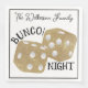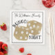 These custom party napkins feature a sophisticated and glamourous game night theme. A large image of gold glitter dice is placed in the centre. It's perfect for your next bunco tournament. A sample family name is printed at the top which you can personalise to include your own custom name or text.