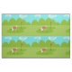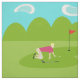 This Retro Golfer Fabric is more fun than a day on the greens. The 1960's style, minimalist art design is anything but par for the course. It features a lone golfer on a lush, green fairway. The mid century modern golfer is making a real fashion statement in his stylish, plaid, golf pants and fuchsia shirt. The blonde, fit, weekend warrior is on his hands and knees attempting to line up a shot. Or maybe he's attempting to give the ball a nudge in the direction of the hole. Does it really matter? At his side, we see a single, golf club. In front of him, is the elusive hole, with a red flag, which is taunting him. The background features a green line of cartoon trees, an aqua sky and two, white, kidney bean shaped clouds. This design is sure to be a hole in one with your favourite golf pro.