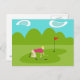 This Retro Golfer Postcard is more fun than a day on the greens. The 1960's style, minimalist art design is anything but par for the course. It features a lone golfer on a lush, green fairway. The mid century modern golfer is making a real fashion statement in his stylish, plaid, golf pants and fuchsia shirt. The blonde, fit, weekend warrior is on his hands and knees attempting to line up a shot. Or maybe he's attempting to give the ball a nudge in the direction of the hole. Does it really matter? At his side, we see a single, golf club. In front of him, is the elusive hole, with a red flag, which is taunting him. The background features a green line of cartoon trees, an aqua sky and two, white, kidney bean shaped clouds. This design is sure to be a hole in one with your favourite golf pro.