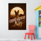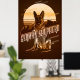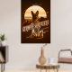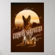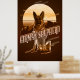 Striking retro-style poster design of a German Shepherd with a background of mountains and large sun graphic all in monochrome shades of gold through brown. A large decorative font names the dog breed. Search ID754 to see other color options and additional dog breeds in this style.