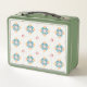 Retro green lunchbox with a floral tile pattern on the front and back. The white background is accented by colorful blue and orange flowers.