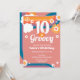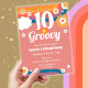 Cute girly retro 10 is groovy birthday invitations. Popular retro rainbow, stars, flowers, and 60s style font. Available as a digital download printable.