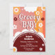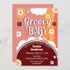 Cute girly retro groovy baby invitations. Popular retro rainbow, stars, flowers, and 60s style font. Available as a digital download printable.