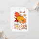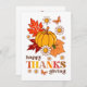 Retro groovy style colourful greeting card. Elegant retro font typography "Happy Thanksgiving", with cute daisy flowers, butterflies, autumn leaves and a pumpkin. The card includes a wonderful greeting message at the back which can be personalised.