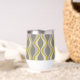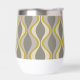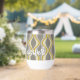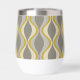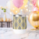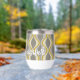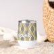 A mod patterned gold stemless with a place for a simple monogram. The taupe, grey and gold design has a groovy organic wave pattern. A minimal look in subtle colours with a simple serif font for a monogram.