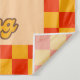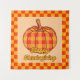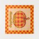 Retro groovy style colourful Thanksgiving tapestry. Elegant retro font typography, with a cute plaid pumpkin and red and orange chequered frame.