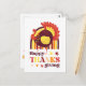 A colourful greeting card with elegant typography "thanksgiving" text, and a cute turkey with some autumn leaves. The card includes a wonderful greeting message at the back which can be personalised.