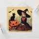 Here's a retro looking Halloween card that features a pretty witch in a bit witch hat with a black cat sitting on a pumpkin. There are bats in the background. The card has a distinctly 60s or 70s vibe. It's a cool card to use as an invitation, as a greeting card or as a card to give with a gift. This card will be appreciated by anyone who likes spooky stuff, retro and vintage art and illustrations and witches.