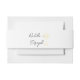 A very elegant and unique whimsical bold black and white and yellow wedding belly band. That matches the whole wedding hand written whimsical suite theme vibe. It has white background and black hand written bride and groom's names and hand drawn yellow champagne glass. with whimsical style standing on the middle.