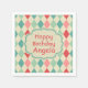 Enjoy a fun retro look reminiscent of the circus with this harlequin personalised design in shades of teal, mint, red, pink and beige. Enter your text into the design template to personalise this napkin for your event. Matching party plates are available in this design.