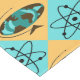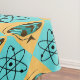This Retro Harlequin Globe Trotter Tablecloth design features a repeating pattern of an abstract oval globe with wood grain continents and atomic symbols. The oceans on the vintage globe are in shades of teal and turquoise. The globe is on a triangular wooden stand and the whole world is on a wheat coloured background. The atomic symbols are on a turquoise background. This design is kitschy, space age goodness at its finest!