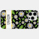 This iphone 15 pro max iphone case is so cute and girly! It's hippie 70s daisy floral pattern with multi-sized white and yellow daisies on a black background and your name in a fun trendy font will go with everything! It will look fabulous on your phone!