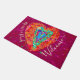 This Valentine's day door mat features a retro hippie styled heart in red, pink and turquoise on a pink background. One one side it has the word "Welcome" and the other personalise with a couple's names in modern script. Designed by world renowned artist Tim Coffey.