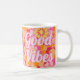 Cute "Good Vibes" mug with retro power flower pattern in bright pink and orange.