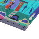 This Retro Holiday Cartoon Party Cutting Board will put you in the holiday spirit. The design features the exterior of a mid century modern house. Through the floor to ceiling turquoise glass walls, we can see the navy blue silhouettes of festive party goers. There is a couple chatting in front of a green Christmas tree, which is decorated with teal ornaments. On the opposite side of the room, we can see a dancing man and the long-winded man everyone is trying to avoid. The exterior of the house features a cheery red door with a holiday wreath, an oversize purple brick fireplace, and strands of colourful Christmas lights. A grey walkway is cutting a swath to the front door, through the teal grass. The nighttime scene has a dark blue sky with a yellow, crescent moon. The plastic snowman decorating the front yard is being greeted by the first snow flurries of the season. An attractive couple is doing the cha-cha-cha on the way to their car. The blonde woman is wearing a bright red dress. She is holding a sprig of mistletoe in one hand. Her handsome escort is wearing a black suit and a red tie. His hands are wrapped around the woman's waist. On the street, in front of the house, we can see three, brightly coloured classic cars. Order today and party like it's 1959!